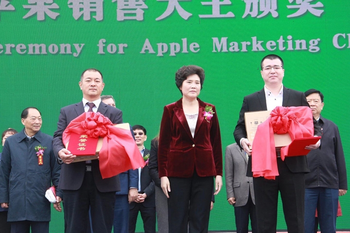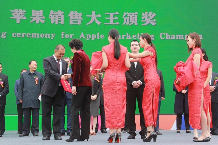 10月16日,在第十五屆中國·山東棲霞蘋果藝術節(jié)開幕式上,“棲霞蘋果銷售大王”頒獎儀式格外引人注目,在果農們的歡呼聲和掌聲中,中共棲霞市委書記李寧為蘋果銷售大王潘德輝頒獎。