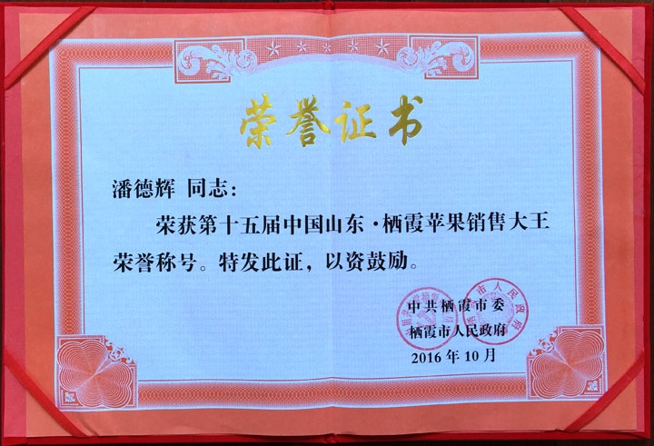 此次“棲霞蘋果銷售大王”評選活動由市委、市政府主辦,全市近百戶果品銷售企業(yè)參與。經過企業(yè)申報、初步篩選和最終評定,棲霞德豐食品有限公司董事長潘德輝被評為蘋果銷售大王。