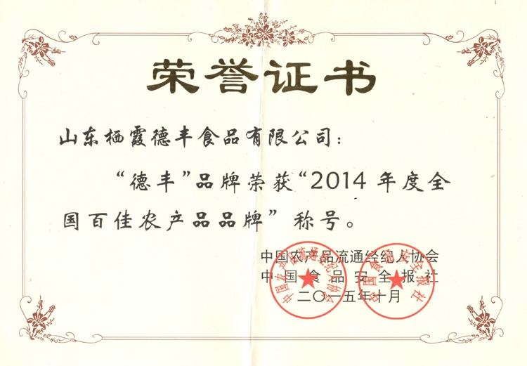 2014年度全國(guó)百?gòu)?qiáng)農(nóng)產(chǎn)品候選經(jīng)紀(jì)人、百佳農(nóng)產(chǎn)品候選品牌經(jīng)過(guò)各地農(nóng)產(chǎn)品經(jīng)紀(jì)人協(xié)會(huì)、供銷合作社,以及共青團(tuán)組織、婦聯(lián)等部門(mén)逐級(jí)推薦,評(píng)委會(huì)辦公室初審,9月12日評(píng)委審定會(huì)審定等程序產(chǎn)生,在2014年度的百佳農(nóng)產(chǎn)品品牌評(píng)選活動(dòng)中,棲霞德豐食品有限公司榮獲全國(guó)百佳農(nóng)產(chǎn)品品牌。